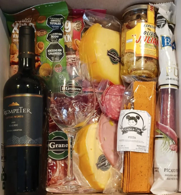 En este pack encontrarás: - Jamon crudo de excelente calidad, ideal para comenzar la experiencia con un toque salado y delicado. - Mortadela con pistacho, una opción suave y aromática que combina perfectamente con quesos. - Salame puro cerdo, con su sabor intenso y textura única para los amantes de los embutidos clásicos. - Queso Pategras y Queso Gouda, dos variedades irresistibles para acompañar y complementar cada bocado. - Maní japonés y berenjenas en escabeche, snacks y vegetales en conserva que aportan crocancia y frescura. - Fuet Bocatti y talitas saborizadas, ideales para picar y compartir momentos inolvidables. - Finalmente, una botella de Trumpeter Malbec para brindar con elegancia, junto con una copa especialmente diseñada para disfrutar esta reconocida variedad argentina.